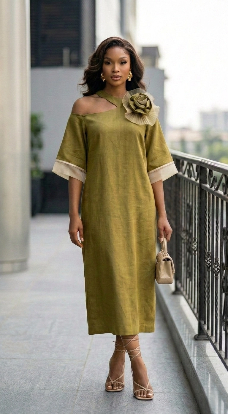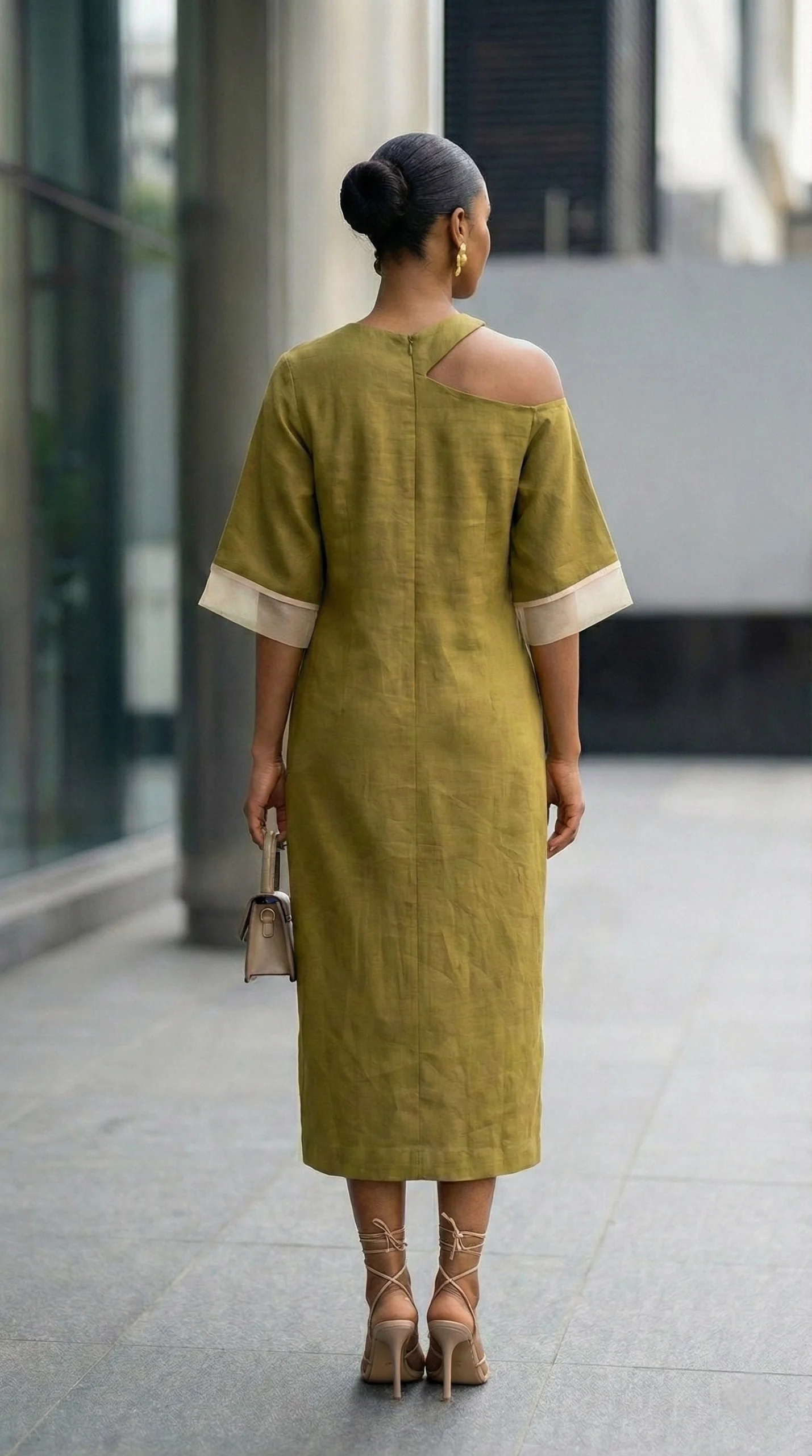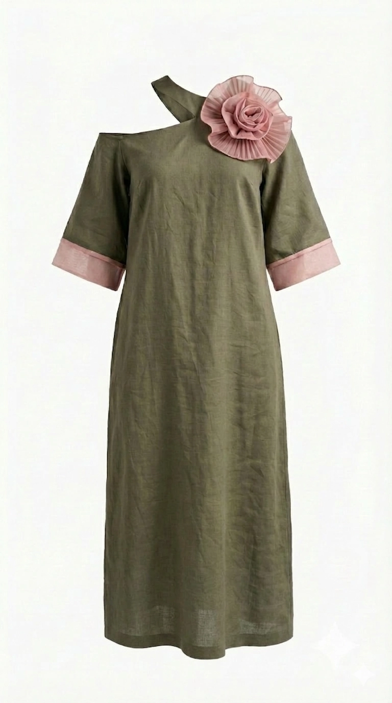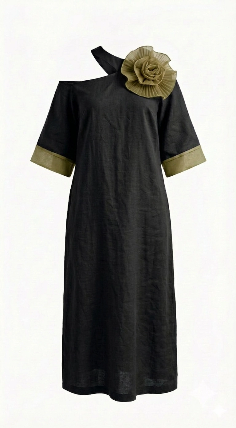A mid-length dress cut from linen, shaped in a relaxed silhouette with an asymmetric neckline that adds a quiet point of interest. Organza detailing on the sleeves and a sculpted floral accent introduce contrast in a controlled way, keeping the overall look refined without feeling overworked. It holds attention through its finish, not