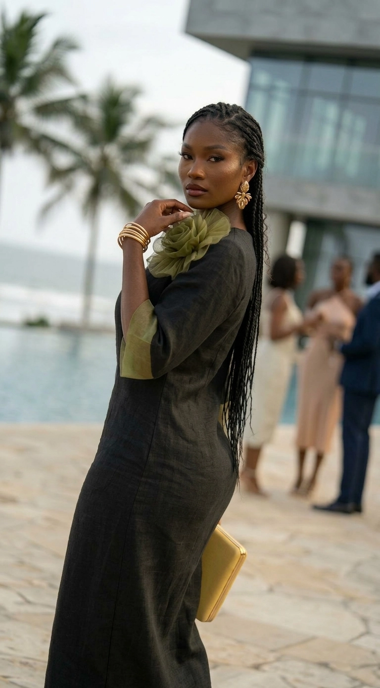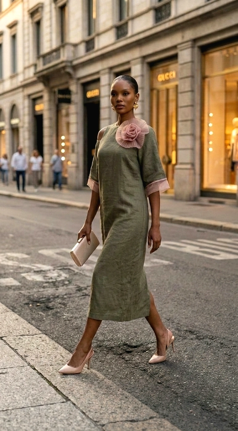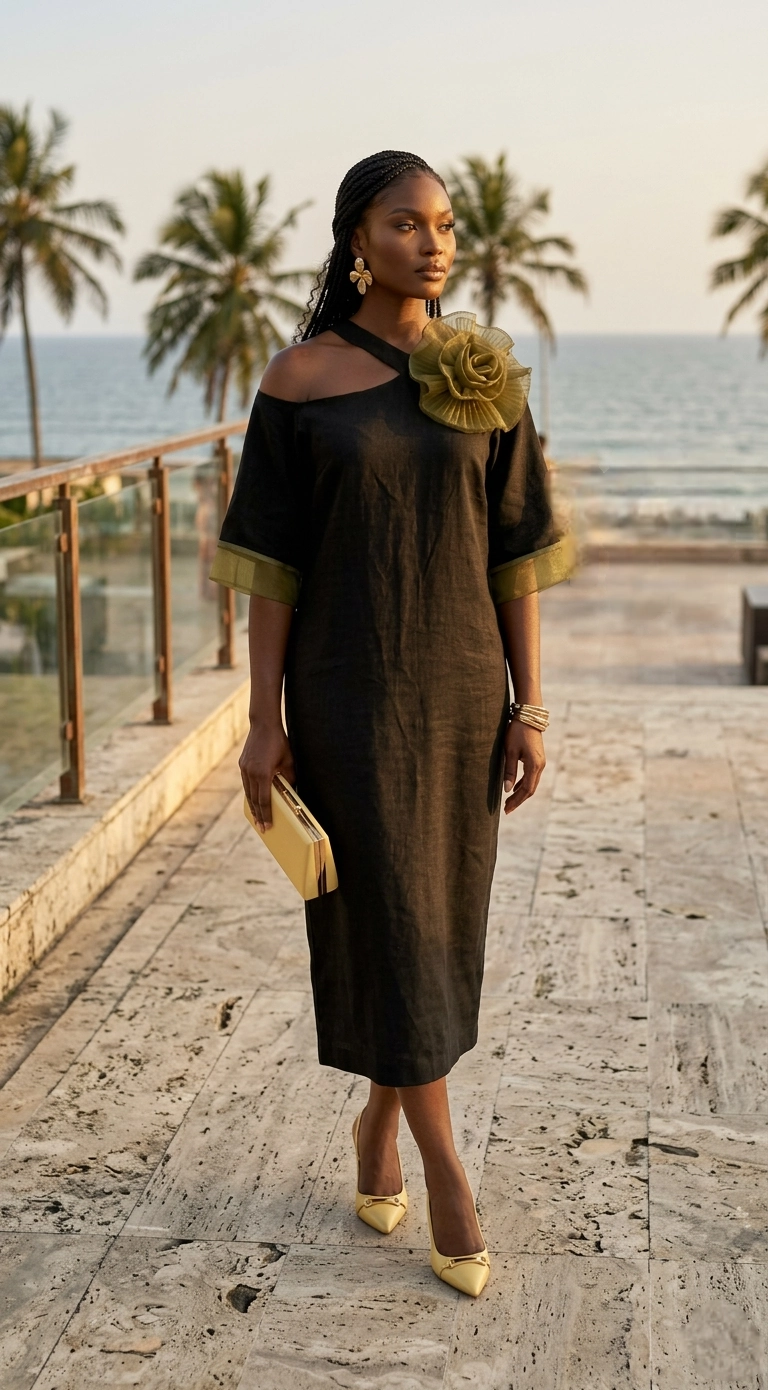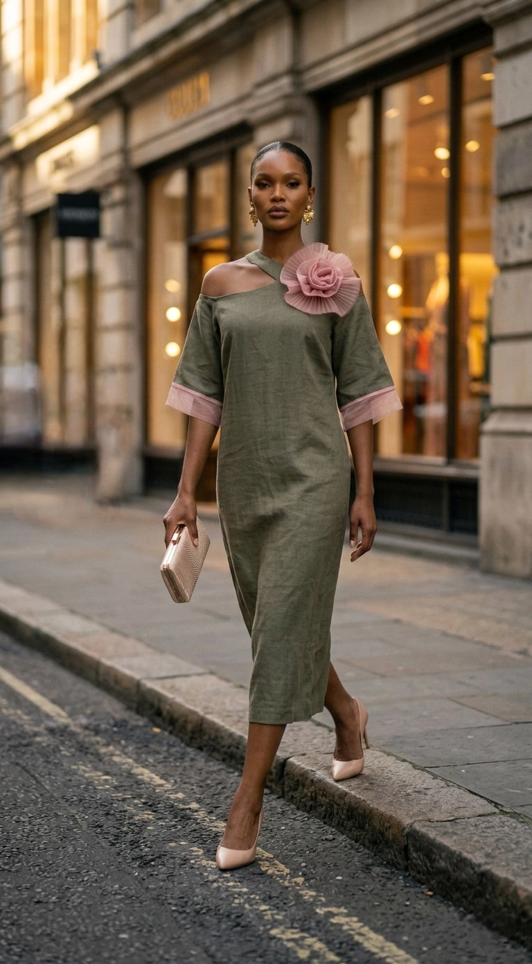 A mid-length dress cut from linen, shaped in a relaxed silhouette with an asymmetric neckline that adds a quiet point of interest. Organza detailing on the sleeves and a sculpted floral accent introduce contrast in a controlled way, keeping the overall look refined without feeling overworked. It holds attention through its finish, not